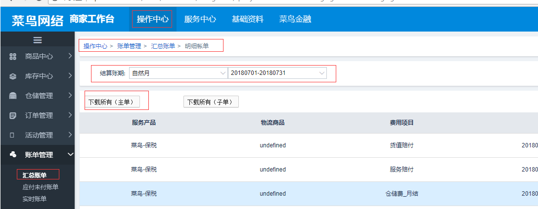 登入菜鸟后台后,点击“操作中心”->“账单管理”->“汇总账单”->“明细账单”,进入后选择对应自然月,点击“下载所有(主单)”按钮下载菜鸟单据。