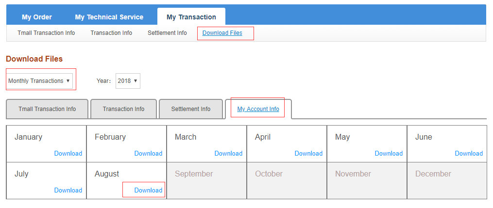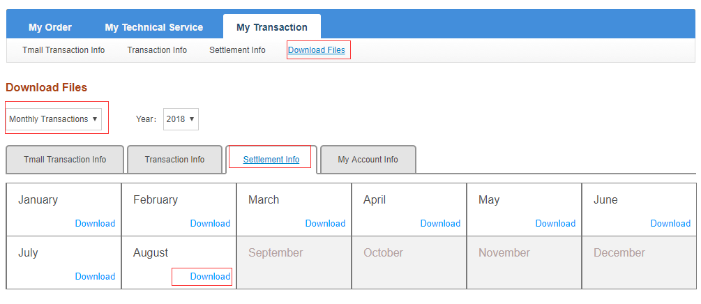在天猫国际支付宝后台,导出Settlement压缩包,导出步骤“My Transaction”->"Download Files"->选择“Monthly Transactions”下拉框->点击“Settlement Info”Tab区域->选择需要下载的月份文件。