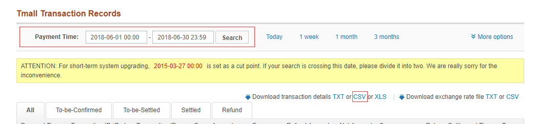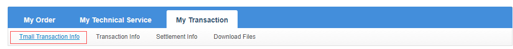 进入国际支付宝后台,在“My Transaction”下“Tmall Transaction Info”子菜单下载TmallTransaction Detail的CSV文件: